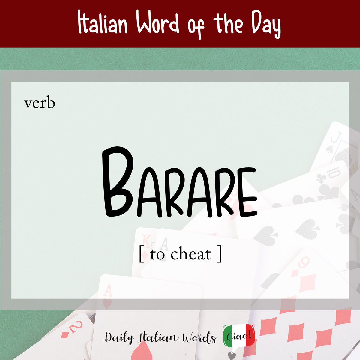 Nobody likes a cheater, but they exist in every game, no matter what you play. In Italian, the verb for to cheat at a game, sport or exam is barare. barare to cheat Barare is an intransitive verb that comes from baro, meaning a card sharp (or card shark)—someone who cheats at cards to win …
