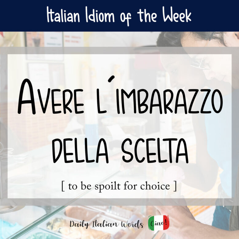 The biggest difference between the two expressions is that, in English, we use “to be spoilt” which in Italian literally translates as essere viziato, whereas Italian uses avere l’imbarazzo. The word imbarazzo refers to any obstacle, nuisance, embarrassment, or hindrance that impedes the normal performance of an operation. So, avere l’imbarazzo della scelta can be literally translated as to have the obstacle/embarrassment of choice.
