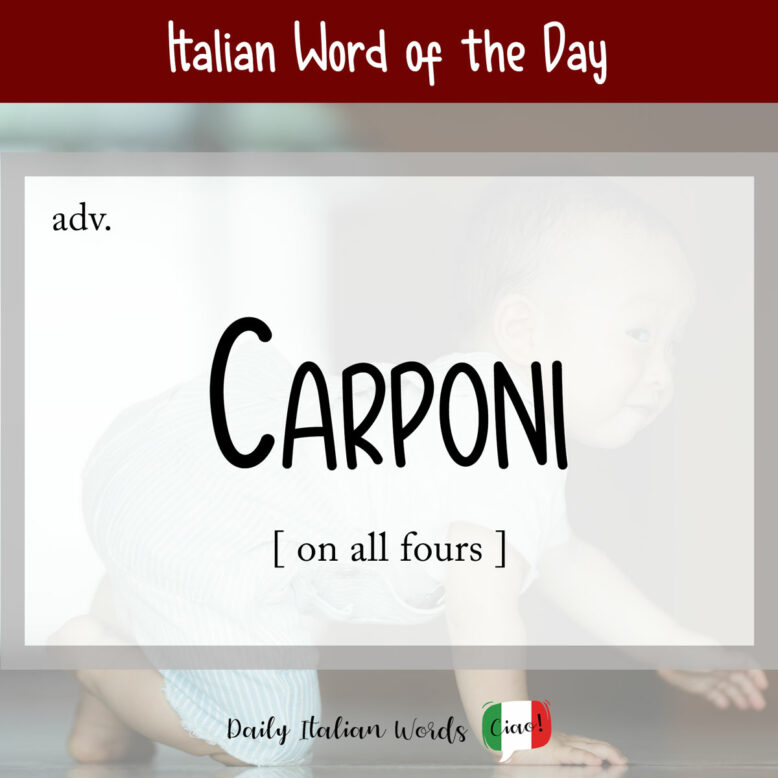 The adverb carponi (also written as a carponi or the less common carpone) is how you would say on all fours or on one’s hands and knees in Italian. It is probably connected with the Latin carpere which means to swipe or to pilfer.