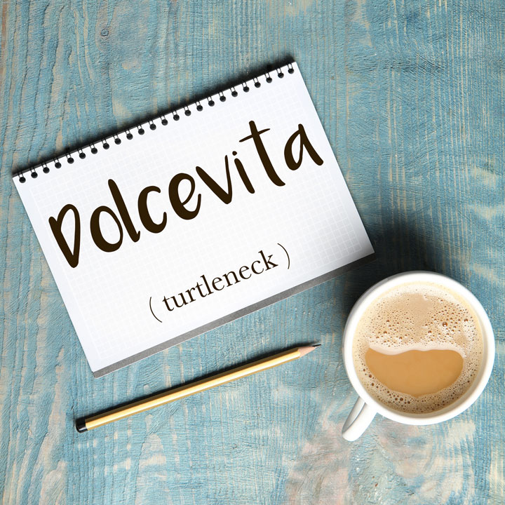 Dolce vita or la dolce vita is Italian for the sweet life but when combined into a single word, dolcevita, we get the term for the kind of sweater Americans call a turtleneck and the British call a polo neck.