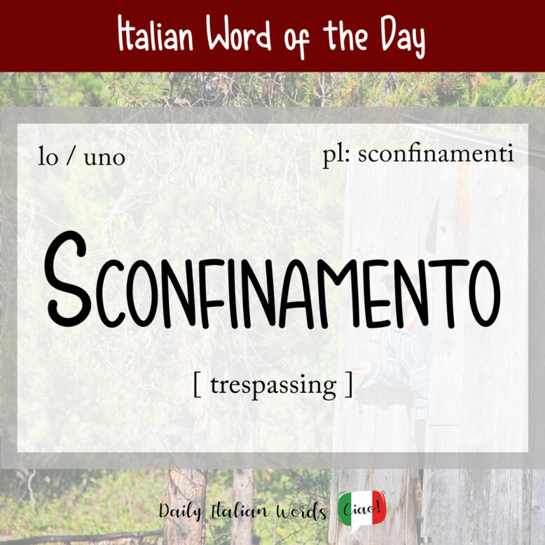 The word for the act of trespassing is sconfinamento. It is the combination of the verb sconfinare (meaning to trespass or to cross over) and the suffix -mento (-ment), which forms nouns that represent the action of a related verb.