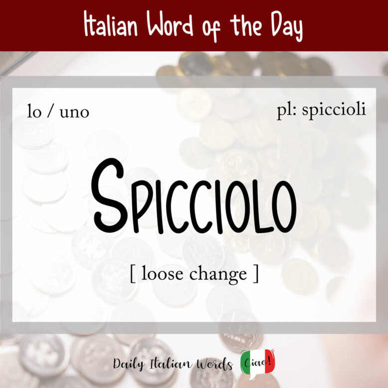 Spicciolo is the word for loose / spare / small change or coins in Italian. It derives from the verb spicciolare which means to pick off or to change (a sum of money) into (a different currency or denomination).